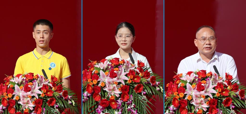 启迪数字学院数据Q254班范泽华作为新生代表发言。国家奖学金获得者、第六届“最美科大”大学生年度人物—“学习标兵”、第二临床医学院医学检验221班胡斯荃作为老生代表作经验分享。首批八桂青年拔尖人才、广西模范教师、广西杰出青年基金获得者电子工程学院陈华金博士、教授代表全体教师,对2025级新生送上开学寄语。学校2010届优秀校友、深圳市“孔雀计划”海外高层次人才、深圳大学博士、特聘研究员、博士生导师黄晓旭应邀作为校友代表发言。柳州市铁一中学党委副书记、纪委书记李桂林作为家长代表发言。