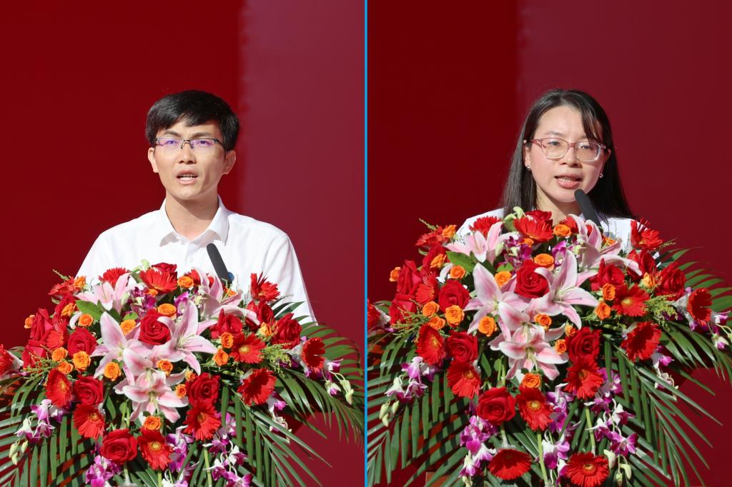 陈华金(左)、黄晓旭(右)代表教师和校友发言