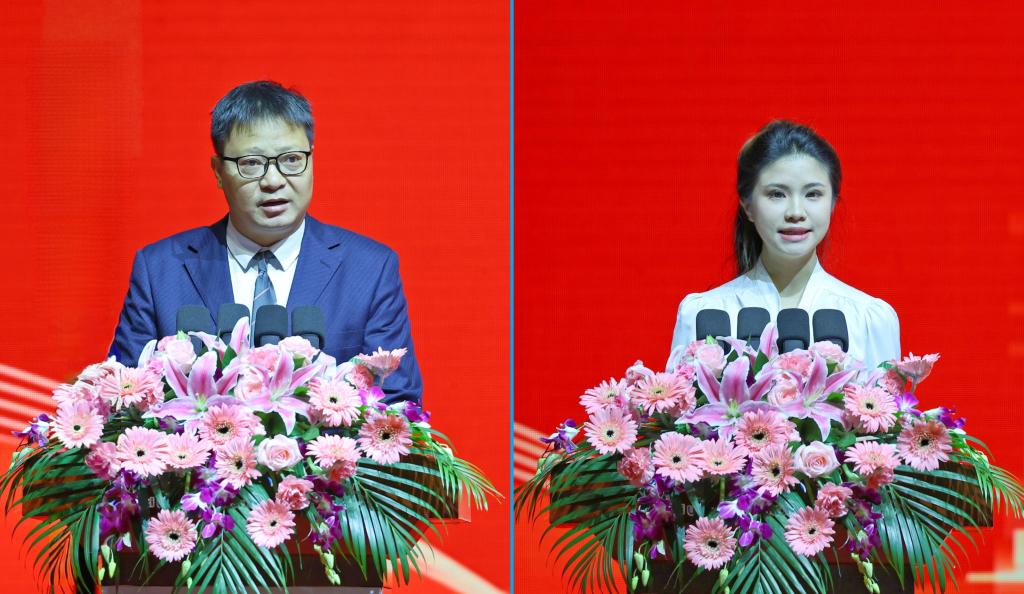 全国模范教师,自治区高校黄大年式教师团队负责人、生物与化学工程学院易弋教授(左)作为教师代表发言,人文艺术与设计学院社工231班孙文悦(右)作为学生代表献词