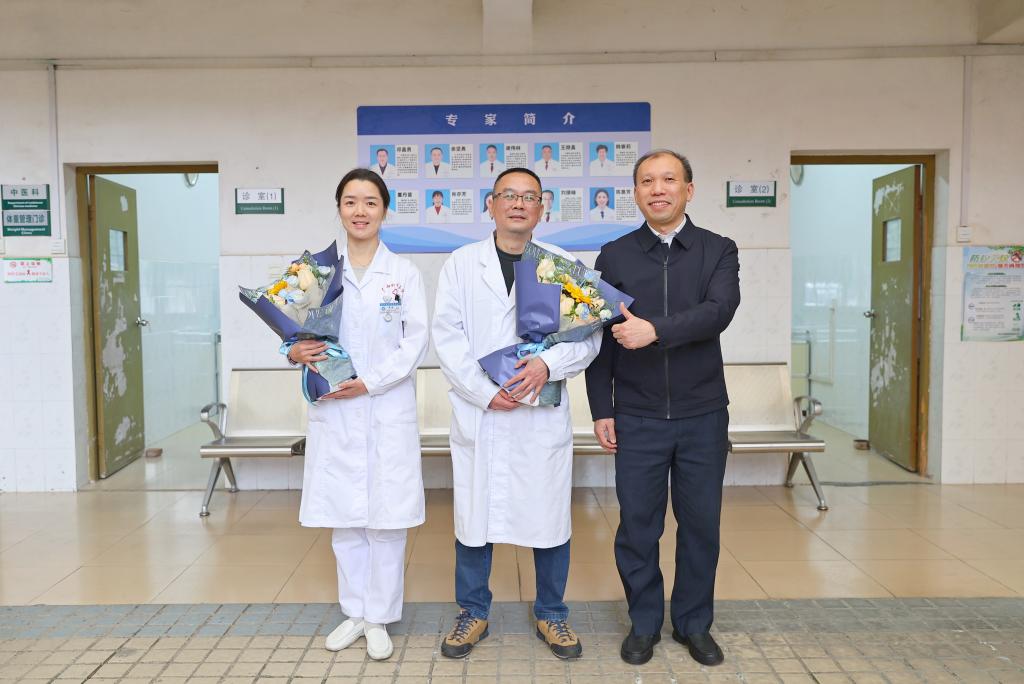蔡亮(右)为余坚勇(中)、韦玮(左)送上鲜花
