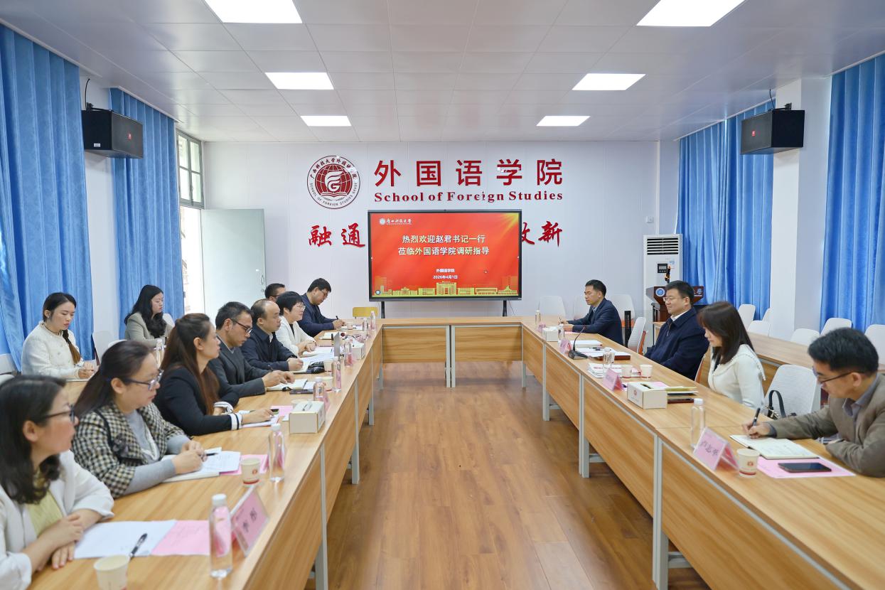 4月1日上午,学校党委书记赵君率队到外语学院调研指导工作,学校党委常委、副校长邓朗妮陪同调研。调研座谈会在文昌校区第二教学楼外语学院会议室举行。
