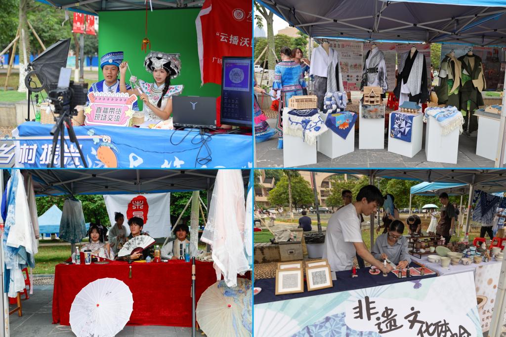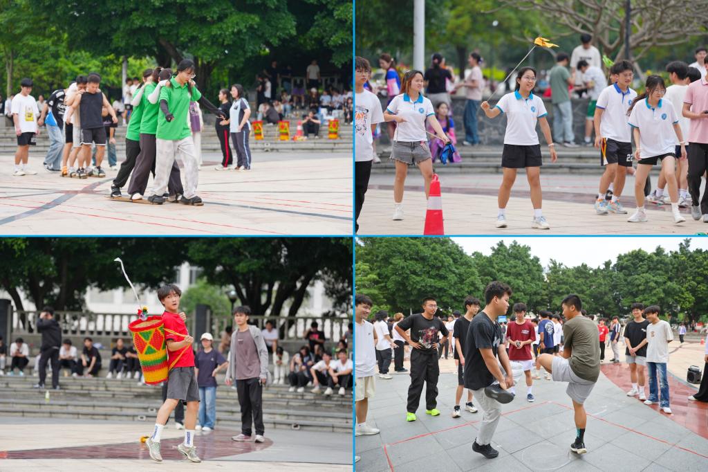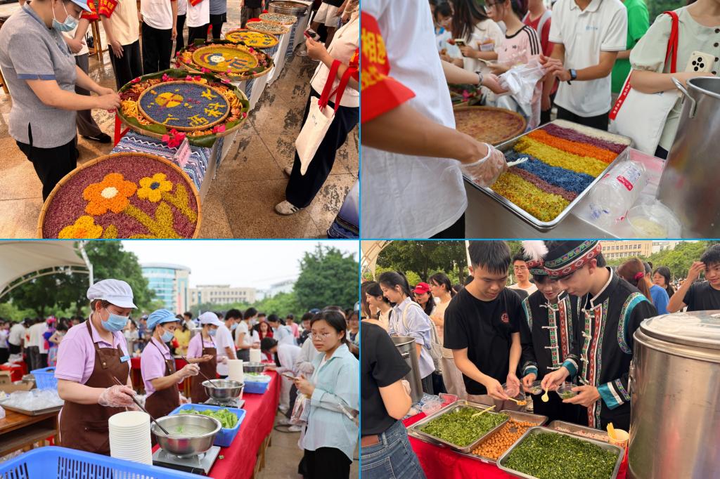 活动现场热闹非凡,民俗体验区设置扎染、坭兴陶、拓印、竹竿舞等互动项目,师生亲手参与,沉浸式体验中华优秀传统文化魅力。螺蛳山美食文化节同步亮相,五色糯米饭、特色油茶、螺蛳粉等美食,让大家在舌尖上品味民族风情。民族传统体育运动会上,各参赛队伍奋勇拼搏、默契协作,尽显青春活力。青年歌圩山歌擂台赛,歌声悠扬,各族师生在交流互动中增进情谊。