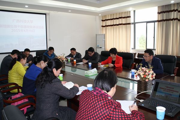 谈话会上,12名新提拔的干部现场签订了“广西科技大学处级干部廉政承诺书”。机械工程学院党委副书记、副院长何敏代表新任处级干部宣读了廉政承诺书。