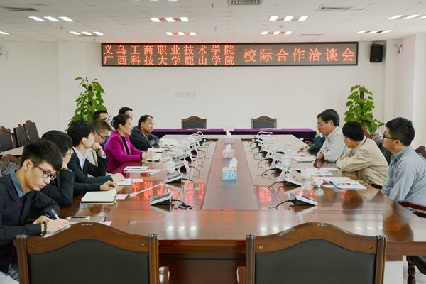 4月24日上午,国家旅游商品研发中心管委会主任、义乌市工商职业技术学院院长王珉一行四人莅临鹿山学院参观考察,并进行合作洽谈。