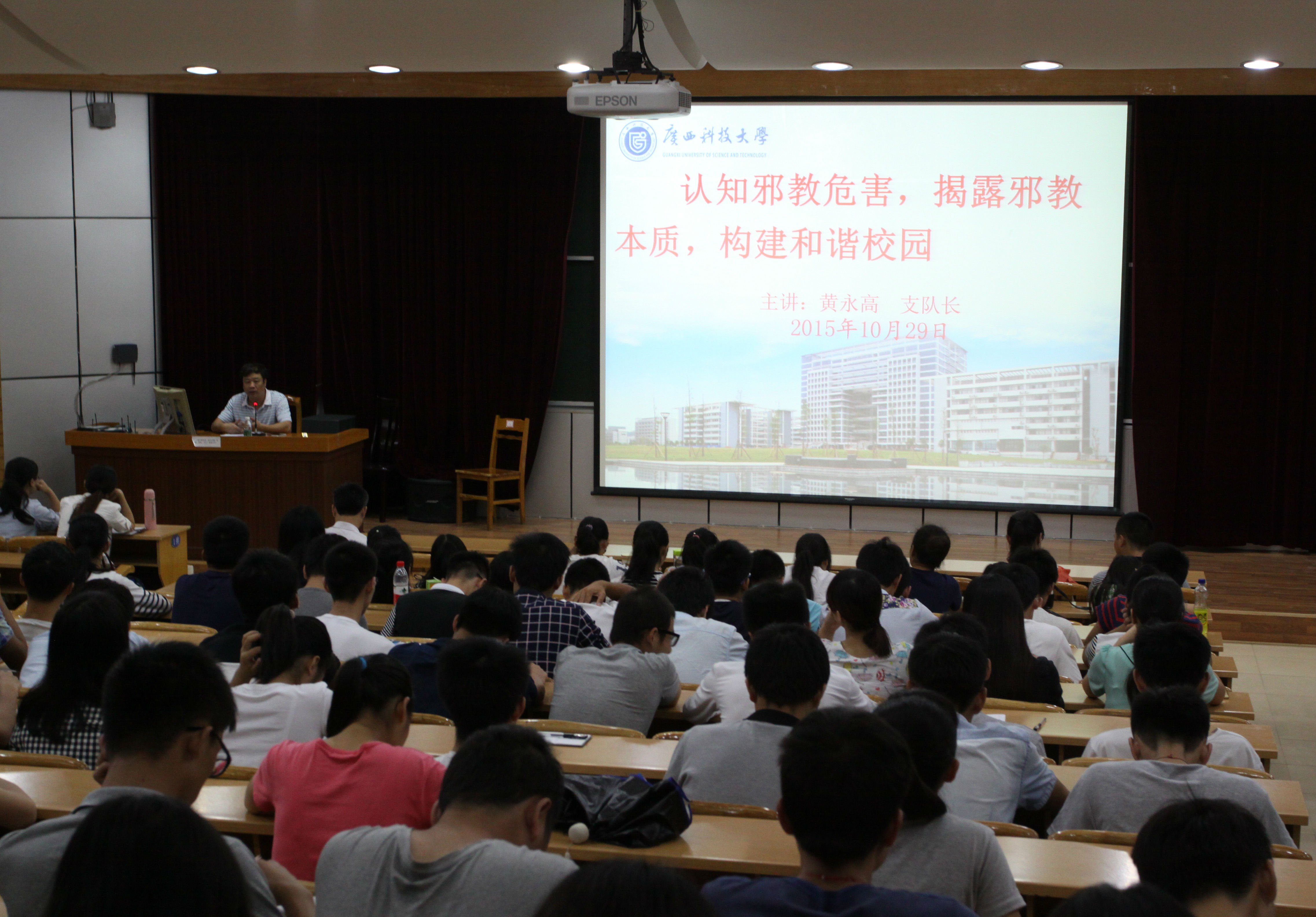10月29日下午,校党委统战部邀请柳州市公安局反邪教支队黄永高支队长到我校进行反邪教警示教育讲座,讲座在第四教学楼四阶四教室进行。校党委统战部、宣传部、学工部、保卫处、人事处等相关部门人员,各学院党委副书记、团委书记、辅导员及学生200余人到场聆听讲座。