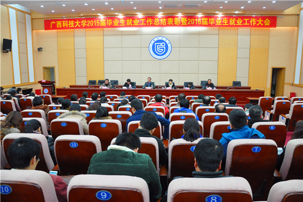 1月13日下午,广西科技大学2015届毕业生就业工作总结表彰暨2016届毕业生就业工作大会在学校多功能报告厅隆重举行。校领导覃伟年、覃萍、姚金光及校长助理覃远生、谢苇出席大会,校毕业生就业工作领导小组成员、各二级学院党委书记、院长、副书记、负责就业工作的辅导员、毕业班班主任代表近150人参加会议,会议由招生就业中心主任黄厚南主持。