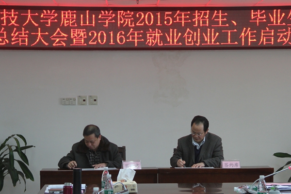 会上,学院党委副书记、副院长梁书杰就2015年招生、毕业生就业创业工作作总结,并传达了教育部、自治区教育厅关于做好2016年毕业生就业创业工作的相关会议文件精神。为了进一步落实工作要求,李利军副校长代表学院与各系部负责人签订了《广西科技大学鹿山学院2016年毕业生就业创业工作目标责任书》。