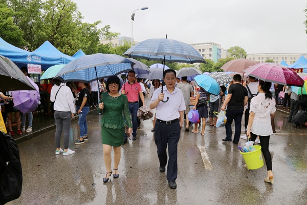 9月11日上午,广西科技大学副校长、学院院长李利军和全体党政领导冒着大雨来到报到注册区域,现场协调指导工作,并与新生及家长们亲切交流。