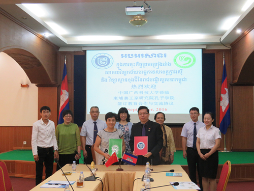 代表团一行首先访问了柬埔寨王家研究院及孔子学院,受到了王家研究院院长克洛媞达院士的热烈欢迎。双方就两校的科研、学生互派等工作进行了深入探讨。王家研究院孔子学院柬方院长谢莫尼勒博士对目前孔院的办学情况进行了详细的介绍,我校覃萍副书记简要地介绍了我校的办学历史与国际交流现况。针对柬埔寨目前紧缺的医药、技术人才,双方提出了多种合作模式与方案。最后,两校签订了校际合作备忘录。