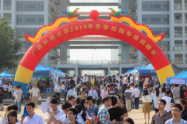 11月18日上午,“广西科技大学2016年冬季校园专场招聘会”在宗元后广场隆重举行。招聘会共有中铁建设集团、柳州钢铁集团、广东碧桂园物业服务股份有限公司、杭州友华通信工程设计有限公司、深圳市大疆百旺科技有限公司、中铁上海工程局五公司、湖南中大建设工程检测技术有限公司等近300家区内外企业参加招聘会,提供了近9000个就业岗位,涉及土建、机械、电子、管理、物流、财会、生物化工、社会工作等领域及行业。经面试洽谈,有约380名毕业生与参会企业达成初步就业意向。