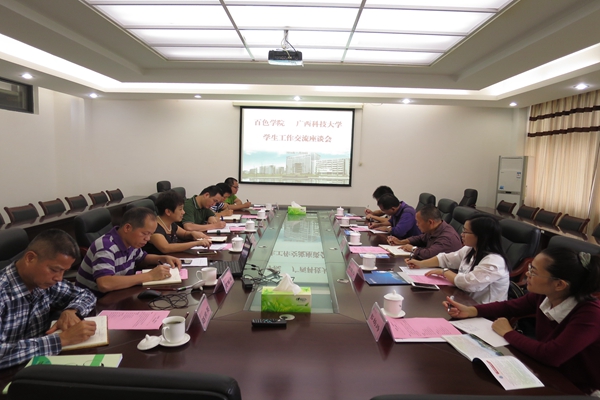 11月20日下午,广西百色学院党委委员、副校长徐魁峰一行5人到我校进行学生工作及就业创业工作的专题考察交流,校党委副书记覃萍热情接待来宾并主持座谈会。我校学生工作部(处)、招生就业中心及外国语学院领导参加了座谈会。座谈会在学校行政楼5-1会议室进行。