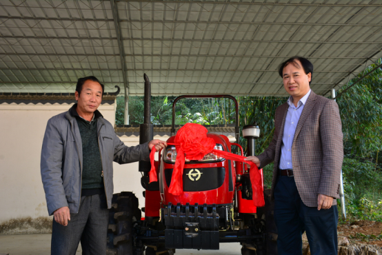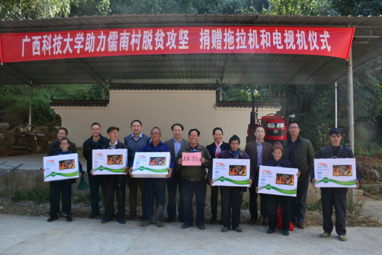 在儒南村,韦总会计师首先代表学校向该村捐赠了1辆拖拉机,向该村18家贫困户各捐赠了1台电视机。在捐赠仪式上,韦总会计师表示本次无偿捐赠拖拉机和电视机体现了我校广大师生对儒南村贫困群众的关怀和深厚感情,下一步我校将继续履行帮扶职责,为儒南村的脱贫致富出谋划策,提供帮助,改善困难群众的生产、生活条件。融安县人大常委会副主任黄绍美代表融安县委、县政府对我校给予儒南村的捐赠表示感谢。她指出广西科技大学对儒南村进行了强有力的帮扶,希望儒南村村委能够借助这些帮扶,扎实工作,带领群众脱贫致富,完成脱贫攻坚任务。