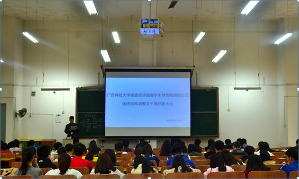 4月11日下午,广西科技大学家庭经济困难学生梦想助跑团在5北103教室召开总团组织结构调整及干部任职大会。出席本次会议的有学生资助管理中心副主任周东老师,学生资助管理中心李瑞妮老师;梦想助跑团总团全体成员及各学院分团主要干部参加会议。会议由梦想助跑团总团副秘书长黄莉蓉主持。