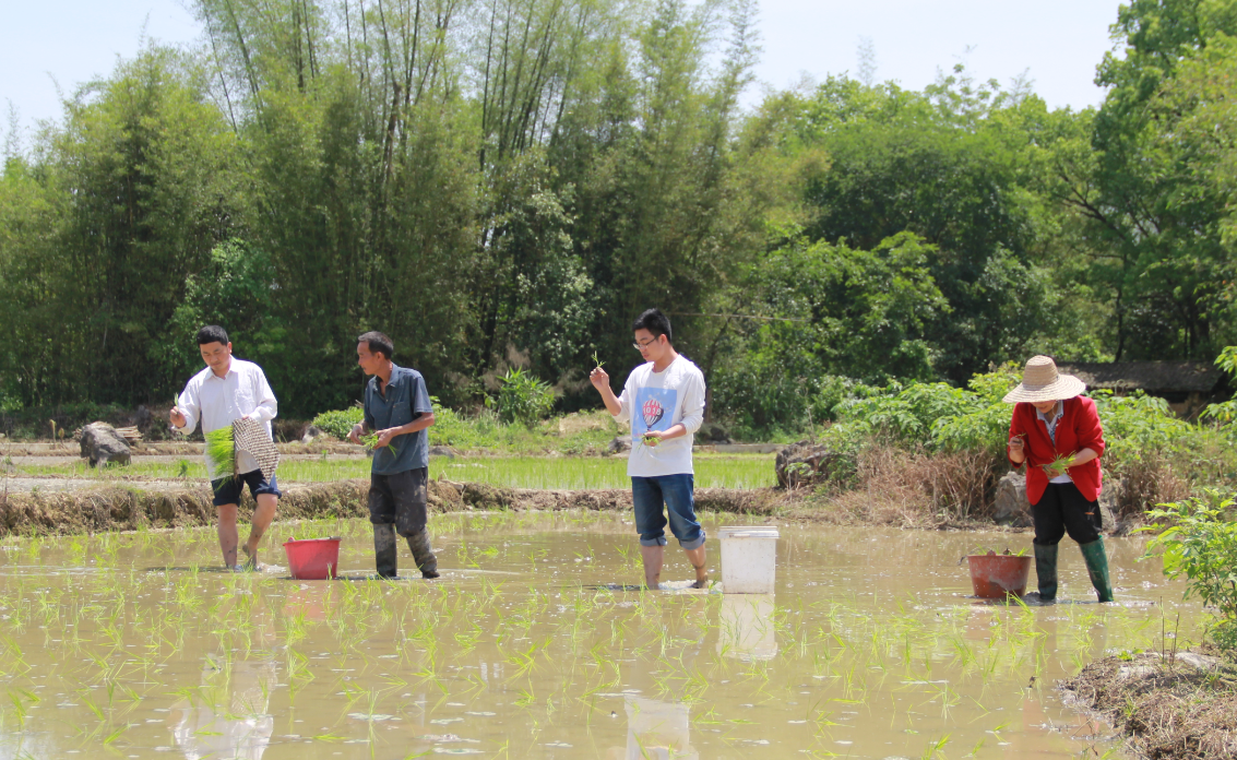 阳光明媚,烈日当头,两组队员却干劲十足。熟悉农活的男同志撸起裤腿、光着脚丫与农户肩并肩地干活;女同志帮忙扯秧苗、送秧苗,或是在田埂边帮着抛秧。大家互相比赛,看谁抛的秧苗更整齐,谁更熟练。两组队员还互相帮助,这组干完了,赶赴另一组帮忙,两队齐心,不知不觉一直干到了中午1点,共帮两户家庭抛种了约4亩多的秧苗。