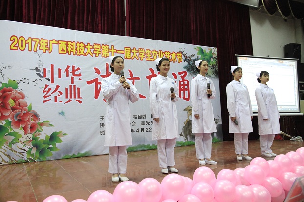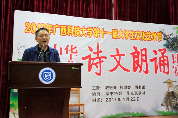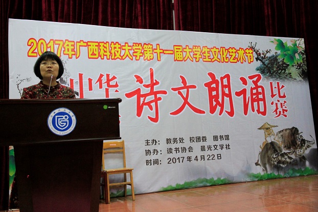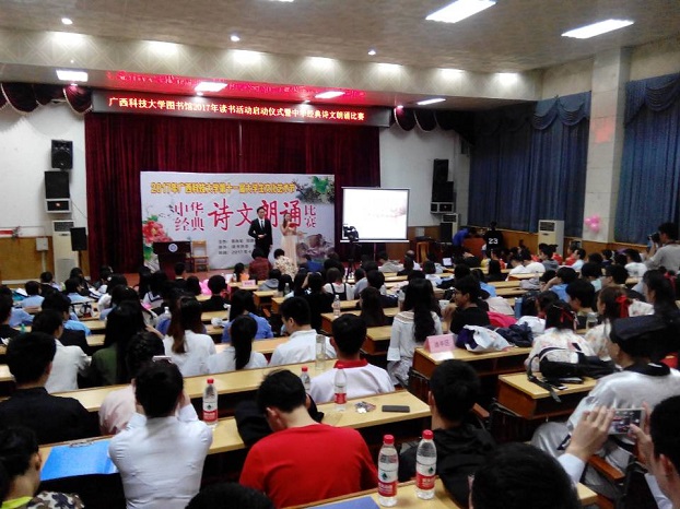 4月22日晚,在4·23世界读书日前夕,学校2017年读书活动启动仪式暨中华经典诗文朗诵比赛在东环校区图书馆报告厅隆重举行。本次活动由教务处、校团委和图书馆主办,晨光文学社、读书协会承办。柳州市中华文化促进会常务副主席兼秘书长刘沛盛、柳州市中华文化促进会朗诵委员会副主任金笛、鹿山学院常务副院长魏峰、艺术学院副院长谭竺雯、校团委副书记朱广生、图书馆馆长梁晓天、图书馆副馆长莫均超、薛宏珍以及图书馆各部门老师代表参加了活动。来自各个学院、社团的19支队伍近300人参加了本次活动。
