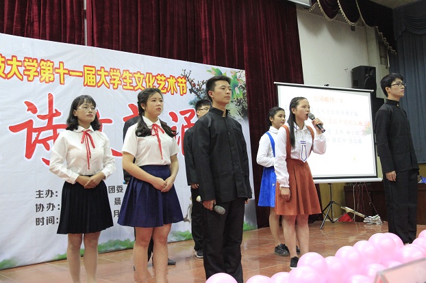 我校第十一届大学生文化艺术节中华经典诗文朗诵比赛在嘉宾金笛的诗歌朗诵中开启序幕。参赛选手们身着表演服饰,以饱满的热情,运用诵读、歌唱、舞蹈等多种表演形式将经典诗文内涵淋漓尽致地展现出来。表演者声情并茂的朗诵,或激昂,或深沉,或空灵……时而铿锵有力,时而深情款款,与之配合的其他表演更是扣人心弦,引人入胜。各队伍朗诵的诗文从古到今,内容丰富,如脍炙人口的《诗经三首》《前赤壁赋》、《岳阳楼记》等古代诗词,以及大家耳熟能详的《少年中国说》《野草》《祖国啊我亲爱的祖国》《致橡树》《相信未来》等现当代诗歌,有的唱出了从军将士的思归情怀,有的歌颂了少年的朝气蓬勃,有的满怀激情地抒发了对祖国的热爱,有的饱含深情回忆青春的美好和对未来的憧憬。精彩纷呈的节目让观众沉浸在浓浓的的书香氛围中,感受着中华传统文化的魅力,享受到一场诗歌的欢乐盛宴。在诗歌有奖竞答环节,大家精神振奋,争先恐后地举手抢答,现场气氛十分活跃。比赛结束后,魏峰老师对本次诗文朗诵比赛进行了简短总结和精彩点评。