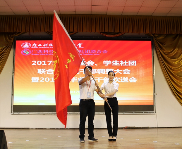 大会在雄壮激昂的国歌声中拉开帷幕。校团委副书记朱广生宣读校学生会、校学生社团联合会主要学生干部任免职文件,沈璐同学任校学生会主席,陈灿阳同学任校学生社团联合会主席。紧接着,新老主席进行交旗仪式,学生干部代表发言。在发言中,前任校学生会主席梁凯表达了大学四年自己作为学生干部对学校和校学生会的感激与不舍,并对新一届学生会和社联寄予希望。新任校学生会主席沈璐表示,自己将以认真负责的态度对待今后的工作,以“求真近道、明德致新”的校训严格要求自己、激励自己。随后,新任校学生会主席沈璐带领校学生会、校学生社团联合会新任主席团干部进行庄严的就职宣誓仪式。