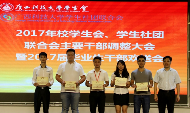 6月18日上午,校学生会、校学生社团联合会主要学生干部调整大会暨2017届毕业生干部欢送会在我校大学生活动中心举行。参加本次大会的有校团委书记陈克文,校团委副书记朱广生、校团委志愿者工作部部长秦文东以及校学生会、学生社团联合会全体学生干部。大会由校团委实践部部长易敏主持。