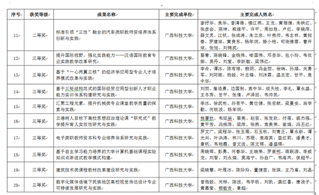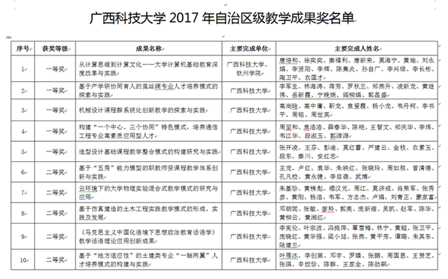 日前,自治区教育厅下发了《关于公布2017年广西高等教育自治区级教学成果奖获奖名单的通知》(桂教高教〔2017〕37号)。其中,10项成果获2017年广西高等教育自治区级教学成果特等奖,80项成果获一等奖,130项成果获二等奖,143项成果获三等奖。我校共有21项成果获奖,其中一等奖5项,二等奖6项,三等奖10项(具体名单见附表)。获奖总数以及一等奖及以上获奖数在全区高校中均排名第六。
