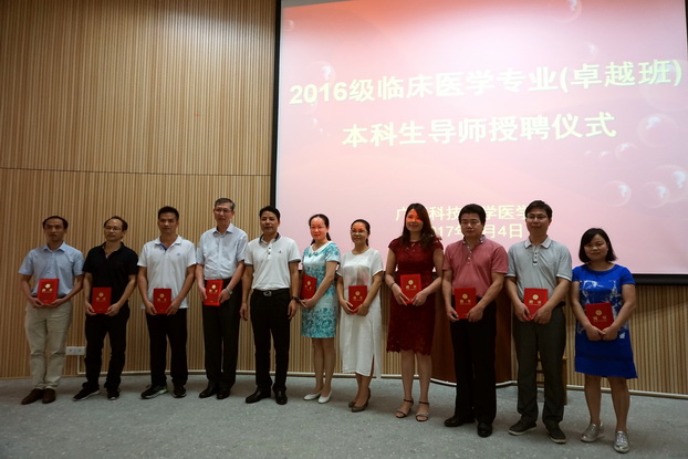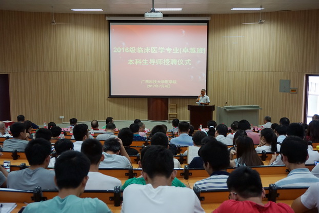 7月4日下午,我校2016级临床医学专业(卓越班)本科生导师授聘仪式在柳石校区医学实验楼第四报告厅隆重举行。学校副校长、医学院院长姚金光,校长助理、第一临床医学院院长谢苇,医学院党委书记黄超,以及第一、二临床医学院的主要领导,来自第一、二临床医学院和附属柳州市人民医院的导师,临床医学专业(卓越班)本科生出席仪式。