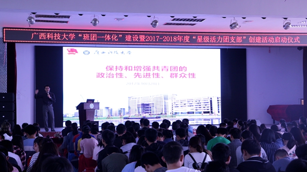 10月28日上午,我校在大学生活动中心举行广西科技大学“班团一体化”建设暨2017-2018年度“星级活力团支部”创建活动启动仪式。校团委领导、各学院团委书记、东环校区各学院学生团委副书记、组织部部长、宣传部部长,2015级、2016级、2017级全体团支部书记,2017级各班班长等500余人参加启动仪式。
