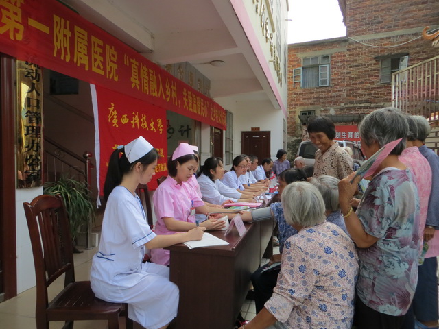 7月30日,恰逢中伏,烈日当空,天气尤其闷热。我校第一附属医院医疗服务队来到我校扶贫点融安县潭头乡开展免费医疗服务义诊关爱行活动,给潭头乡的村民群众送去健康。这是我院为了更好的贯彻落实党的十八大精神,根据学校党委《关于开展2014年暑期大学生社会实践活动的通知》的总体要求和部署,开展的送温暖、献爱心、办实事的惠民活动。