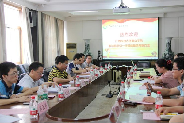 9月29日上午,鹿山学院党委书记韦鸿鹏、五年过渡办主任王维熙和土木工程系主任琚宏昌一行8人到广西建设职业技术学院考察调研。韦鸿鹏书记就学院转型发展、校园建设、人才培养等方面情况进行了介绍。副院长吴丹、教务处长陈刚就广西建设职业技术学院的基本情况、学校发展、人才培养等方面进行了介绍。双方与会人员就人才培养、实验室建设、师资队伍建设、校企合作等方面进行了深入的交流与讨论。