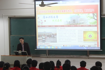 最后,职教学院党委副书记胡耀文老师做了语重心长的讲话。他指出,家庭经济困难只是暂时的问题,同学们通过四年的认真学习和素质提升,将完全有能力改变家庭经济现状。他还打开广西科技大学校友总会网站,向同学们展示了一帧帧杰出校友照片,还以自己大学同学的切身经历为大家加油鼓劲。