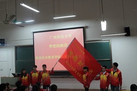 梦想助跑团职教学院分团第一届总干事覃有奖做工作汇报,以PPT的形式对团队开展的志愿服务、素质拓展等进行了展示,总结了工作经验和不足之处,并对新一届团组干部提出期望。尤卫玲老师宣读第二届职教学院分团干事及成员名单,与会领导老师和嘉宾为新干部颁发聘书。之后,第二届分团总干事丁正彬从覃有奖同学手中接过团旗,并带领第二届梦想助跑团成员进行了庄严宣誓。