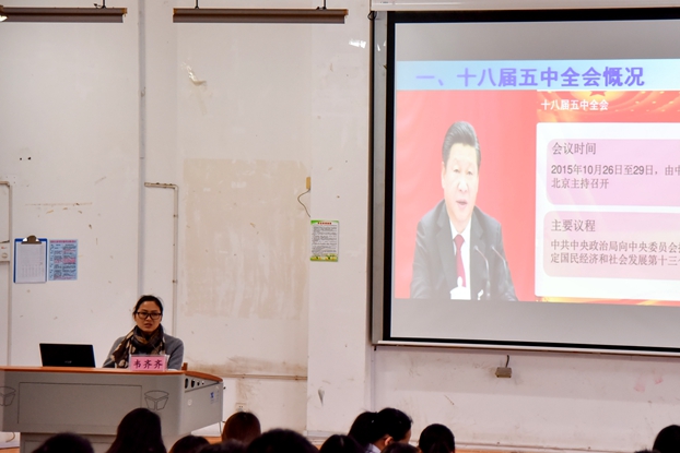 开班仪式后,校团委副书记韦齐齐为全体学生干部做了主题为“贯彻落实十八届五中全会精神,高举旗帜跟党走”的讲座。韦齐齐副书记围绕着十八届五中全会对于坚持和发展中国特色社会主义,实现“两个一百年”奋斗目标和中华民族伟大复兴的中国梦这一主题展开,讲解了“五个发展”理念以及结合当前社会的科技发展、大学生就业等大学生关心的问题,倡议同学们要明确目标,努力奋斗,争创美好人生。韦齐齐老师以生动的言辞为学生干部们上了一趟精彩而有意义的课。