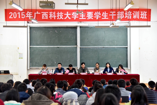 我校2015年校级学生干部培训班于12月26号上午在四阶六举行,本次培训班培训的对象为校学生会、学生社团联合会、青年志愿者总会、青年新媒体中心以及大学生科创中心的400多名学生干部。校团委书记陈克文,校团委副书记韦齐齐以及校团委老师蒋智华、易敏、秦文东以及校学生会主席盘慧凤、学生社团联合会主席袁文岚出席开班仪式,开班仪式由校学生会主席盘慧凤主持。