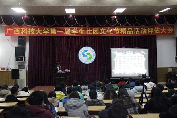 12月29日下午,广西科技大学第一届学生社团文化节精品活动评估大会在图书馆报告厅顺利举行。出席此次大会的有校团委实践部部长易敏老师、社联全体人员以及参与评估的各协会负责人。大会旨在公平公正公开地评选出2015年社团文化节的社团精品活动,促进各社团交流和发展。