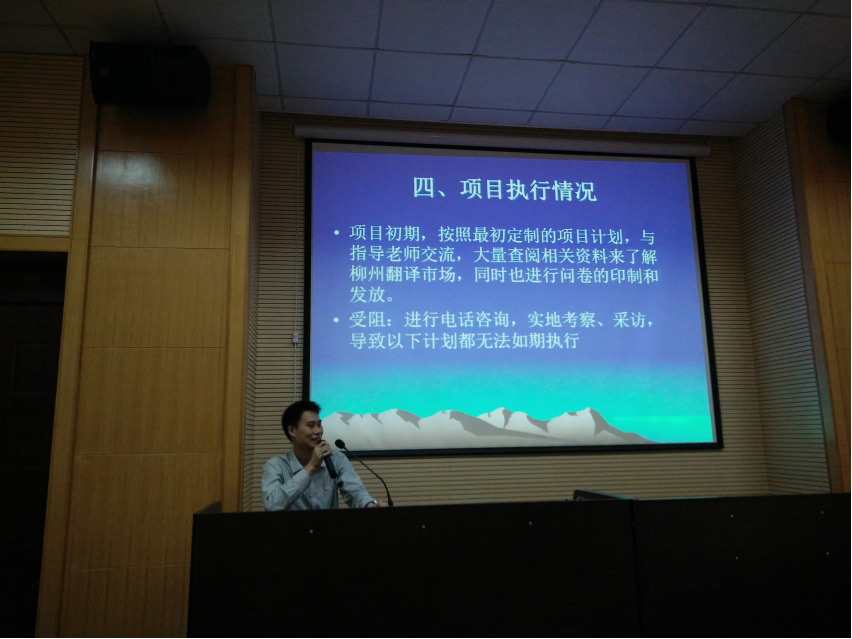 参与答辩的第一个课题是创新训练项目《柳州市文化中心翻译公司市场前景研究》,该项目研究旨在为翻译公司进驻提供咨询参考,从而更好地将柳州产业优势推出去,促进柳州的国际交流和对外发展。第二个课题是创新训练项目《汽车产业英语术语库的建立及其在翻译实践中的应用》,该项目研究利用语料标注工具CLAWS和语料分析软件AntConc、Wordsmith对国产、日系、韩系、欧系和美系汽车术语进行Concordance Hits排名分析,并引入到翻译应用中。第三个课题是创业训练项目《“成译”翻译服务淘宝网店项目》,该创业项目在全民开店潮下应运而生,网店运营过程中共接单二十多单,并取得一定收入。三个项目皆生成了相应的调查报告或论文。