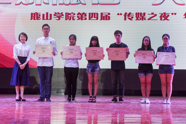 晚会上揭晓了广西科技大学鹿山学院年度传媒大奖平面设计类、音频视频类、新闻报道类作品一、二、三等奖,传媒中心设计部郭建红的海报作品《致,青春中的你》、传媒中心广播站孙旭东的广播节目《鲁班的诅咒》和院团委宣传中心陈征、张立等的新闻《“唱响鹿山”十大歌手十周年音乐盛典开幕》分别获得三个大类的一等奖。汽车系LS Racing车队、电计系团委学生会等单位的选送的作品也榜上有名。晚会同时揭晓的还有经全院师生投票产生的官方微信卡通形象“鹿小山”,由来自电子信息与控制工程系的朴浩杰、黄磊设计。