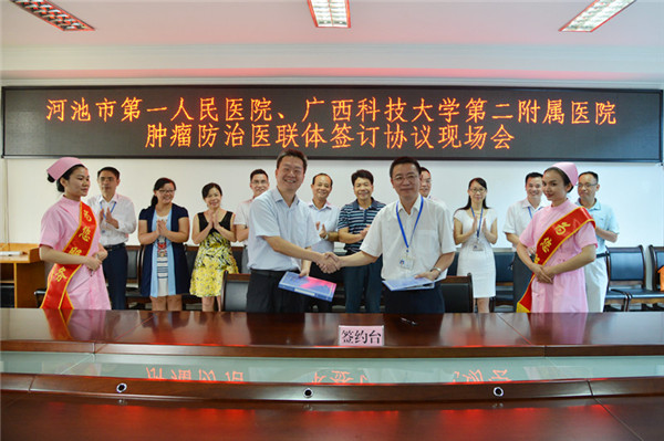 7月13日,我校第二附属医院与河池市第一人民医院肿瘤防治医疗联合体签约、揭牌仪式在河池市人民医院举行。我校第二附属医院院长孙文忠博士、河池市人民医院院长谭仁林代表双方签订了医联体合作协议书,河池市卫计委党组书记、主任韦东禄见证这一重要活动。