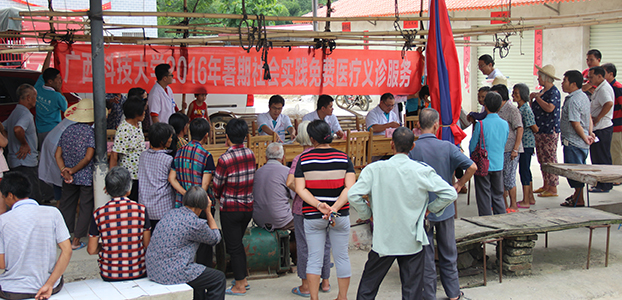 我校暑期大学生“三下乡”社会实践医疗义诊项目已经在忻城县红渡镇连续开展了6年,我校医学专业大学生走进村屯、敬老院,开展新农合医疗宣传和调研,让更多村民了解这项惠民政策,针对所发现的问题,志愿者们整理形成调研报告,向当地政府建言献策。同时为群众提供医疗康复指导、残疾预防意识宣传,提高群众对“治未病”和疾病早期预防的重视。