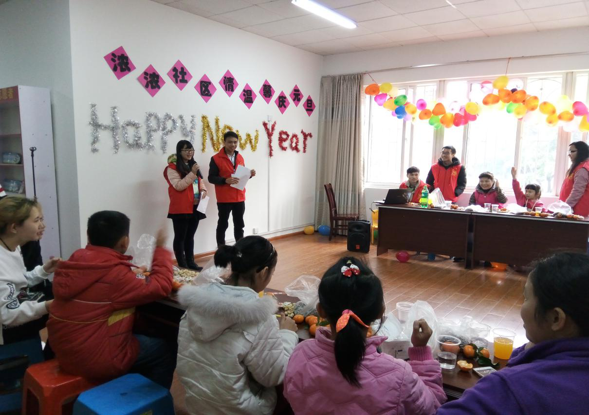 1月2日上午,沐浴着冬日暖阳,在2017年新年伊始,万象更新之际,社科学院社工督导、致用社工机构负责人之一魏三珊老师携社科学院数名社工和志愿者来到锦业社区“儿童家园”项目基地与社区居民同庆元旦。本次活动是继上次“儿童家园”项目揭牌和社区宣传之后的又一大型交流互动活动,这次活动的主题是“欢乐、感恩、畅想、分享”。