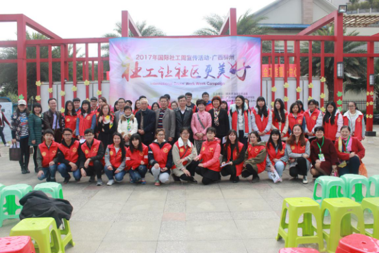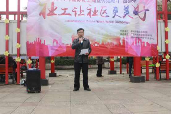 为践行“民政为民、民政爱民”理念,弘扬社会工作大爱精神,展示柳州市社会工作者专业形象与服务成效,提高社会工作认知度和影响力,进一步推进社会工作发展。3月26日,由柳州市鱼峰区民政局主办,广西科技大学社会科学学院、柳州市致用社会工作服务中心承办的题为“社工让社区更美好”的2017年国际社工周宣传活动在柳州市南亚名邸中心广场举行。参与本次活动的有柳州市鱼峰区民政局副局长甘柏林、我院党委副书记梁小延、狮山社区党委书记欧霓、爱心天使志愿组织邹文珍。活动由我院团委书记崔娟主持。