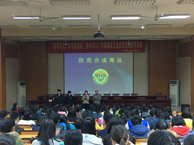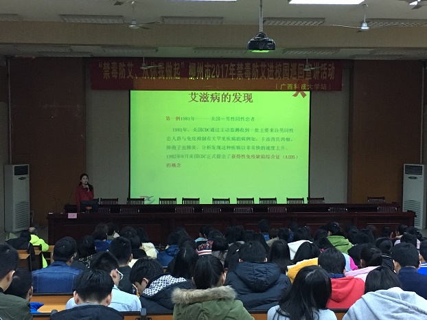 3月25日上午,由团市委、市教育局、市禁毒办、市防艾办共同主办的“禁毒防艾,从你我做起”柳州市2017年禁毒防艾进校园巡回宣讲活动走进我校柳石校区。我校300多名医学生参加了此次宣讲会。宣讲会由第一临床医学院团委书记廖容主持,禁毒办黎剑平主任和防艾办王慧医生担任主讲。