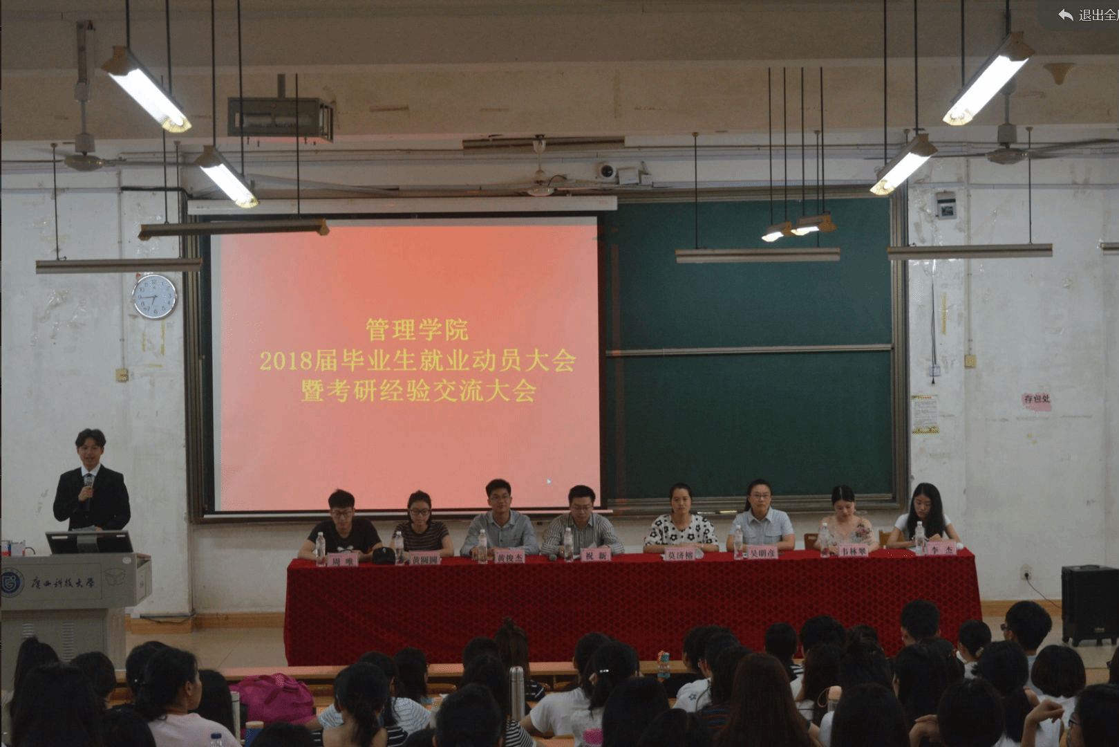 5月11日15:00,管理学院2018届毕业生就业动员大会暨考研经验交流会于四阶一举行,管理学院党委副书记、副院长祝新,辅导员莫济榕、吴明彦、黄俊杰老师出席本次会议。特邀已考研成功的同学韦林翠、黄圆圆、周唯、李杰分享他们的考研经验。