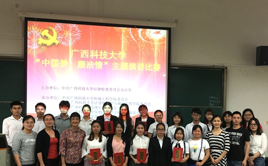 5月25日晚,由学校纪委办公室主办,机械工程学院党委、计算机科学与通信工程学院党委、理学院党委、生物与化学工程学院党委和艺术与文化传播学院党委承办的2017年广西科技大学学生党员“中国梦,廉洁情”主题演讲比赛在东环校区第六教学楼北102教室成功举办。纪委办、监察室副主任赵金和,纪委办、监察室正处级纪检监察员陈雁,机械工程学院党委书记肖学勤、机械工程学院党委副书记何敏、理学院党委副书记夏辛萍和艺术与文化传播学院党委副书记黄大志出席并观摩比赛。比赛的评委由主办、承办单位各指派一名老师担任。本次比赛共150多名学生到场观看。