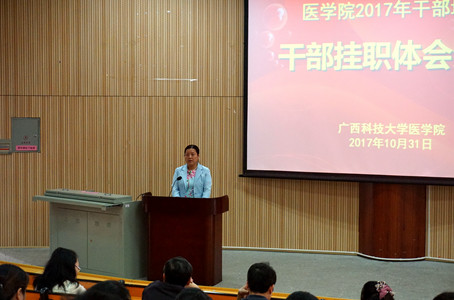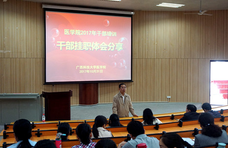 为加强管理干部队伍建设,提高干部服务医学教育的能力和水平,10月31日下午,医学院在柳石校区医学实验楼报告厅组织了一场干部培训活动。活动的主要内容是医学院两年来赴广西医科大学挂职的一批干部进行挂职体会分享。本次活动由学院党委书记黄超同志主持,学院机关和各系部全体行政人员及部分教师参加了此次培训。