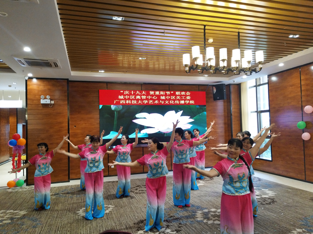 11月2日上午,艺术与文化传播学院学生党支部与城中区离管中心党支部共同举办了“喜庆十九大,欢度重阳节”联欢会。柳州市委老干部局副局长刘德山,城中区委常委、组织部部长王琦,城中区委组织部副部长陈文杰出席观看了联欢会。城中区离退60余名老人代表和艺术与文化传播学院师生党员代表近100人欢聚一堂,庆祝九九重阳节。