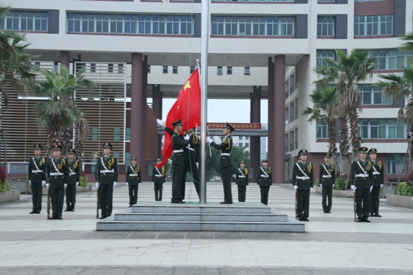 在全体师生的注目礼下,英姿飒爽的国旗护卫队队员们护送鲜艳的五星红旗进场,伴随着庄严的中华人民共和国国歌,五星红旗冉冉升起,迎风飘扬。