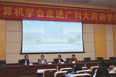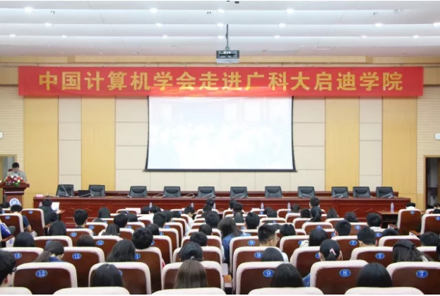 4月14日下午,“CCF(中国计算机学会)走进高校”活动来到我校学启迪数字学院,这是CCF组织的系列演讲公益活动,致力为计算机领域专业人士的职业发展提供服务。会议邀请了中国计算机学会CCF演讲者、“滴滴打车”学术合作总监吴国斌博士作报告,还特别邀请了广西柳州市发改委方华副主任参加报告会。启迪数字学院执行院长洪振挺,党委副书记、副院长黄劲,团委书记胡杰,教师许坤、史新奕以及相关专业的同学聆听了报告。报告会由黄劲主持。