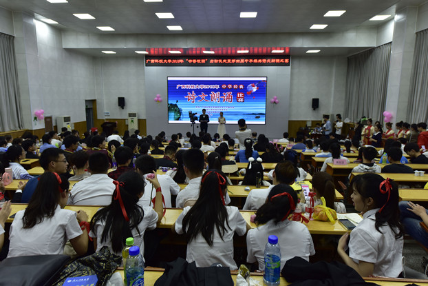 为深入学习贯彻党的十九大精神,弘扬中华文化,进一步促进高等院校精神文明建设和书香校园建设,4月13日晚,在第23个世界读书日即将来临之际,我校2018年“书香校园”读书活动启动仪式暨第四届中华经典诗文朗诵比赛在东环校区图书馆报告厅隆重举行。本次活动由教务处语委办、校团委和图书馆主办,晨光文学社、读书协会协办。柳州市朗诵委员会副会长柳州市孔子文化研究会办公室主任金笛、柳州中华文化促进会语言表演艺术学会秘书长吴荣熙、我校图书馆馆长梁晓天、教务处副处长吴佩玲、校团委副书记韦齐齐、图书馆副馆长莫均超、薛宏珍、省级普通话水平测试员教务处韦桂美老师以及教务处、团委和图书馆的其他老师代表参加了本次活动。来自艺术与传播学院的高楠与财经学院的于馨竹担任主持,全校各学院共19支参赛队伍及观众近250人参加了本次活动。