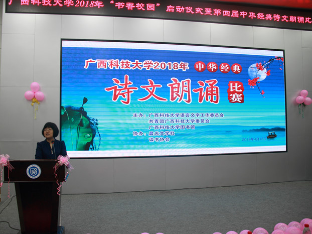 梁晓天为活动致辞。她在致辞中希望大学生们能“不忘初心,传承经典,坚定我们泱泱中华的文化自信”。图书馆举办系列“书香校园”系列读书活动及经典诗文朗诵比赛,让更多的师生爱上阅读,享受阅读。随后,她宣布“广西科技大学‘书香校园’读书活动”正式启动。