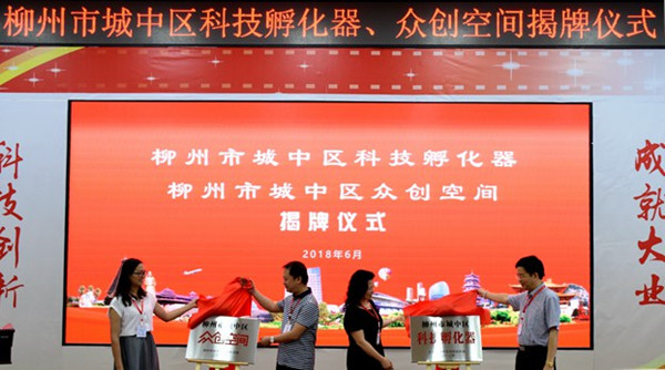 最后,佟德军、贺耀军、惠静、韦齐齐四位领导嘉宾代表城中区和学校,共同为柳州市城中区科技孵化器、众创空间揭牌。