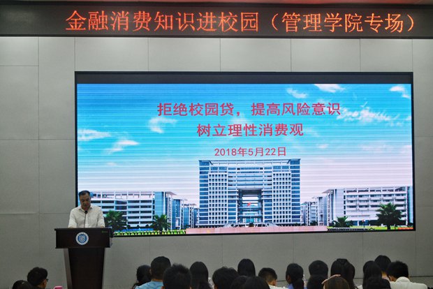 为帮助大学生认清非法校园贷、网贷的危险性,提高自我保护意识,5月22日下午,管理学院团委联合柳州市工商局、柳州市消费者协会、柳州市银行业协会和交通银行柳州红锋支行在图书馆报告厅举办了以“拒绝校园贷,提高风险意识,树立理性消费观”为主题的金融消费知识教育活动,管理学院大一至大三共200多人到场聆听。
