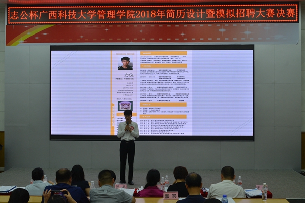 为帮助同学们掌握求职应聘的基本技巧,提高就业竞争力,实现顺利就业的目标。6月18日,管理学院2018年“志公杯”简历设计暨模拟招聘大赛决赛于图书馆报告厅成功举行。此次大赛历时45天,分初赛、复赛和决赛,共有430多名学生参加,最终有19名同学进入决赛。决赛邀请到柳州柳工挖掘机有限公司、中国人寿保险股份有限公司、广西品匠集团柳州公司、广西建工集团第二安装建设有限公司、广西浦发金融服务有限公司、柳州阿佳希软件有限公司等企业的部门经理或人事总监给比赛选手现场进行指导的同时,根据选手表现初步选定了实习生。